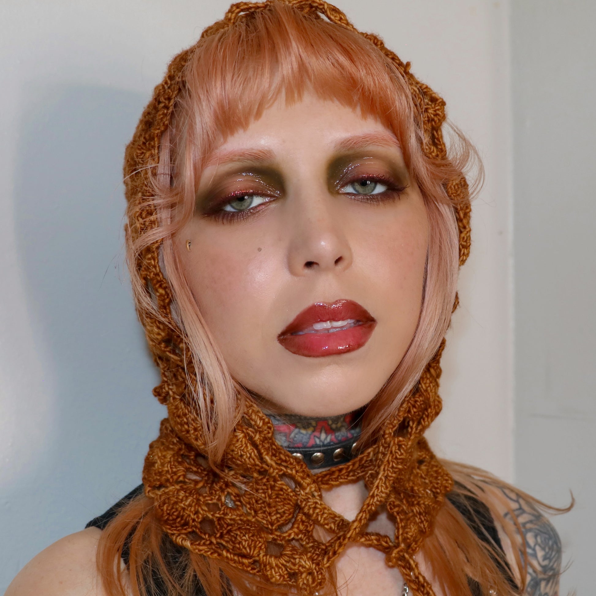 This hood is hand crocheted with Merino Wool yarn. It has a lace up tie at the neck that is also crocheted.