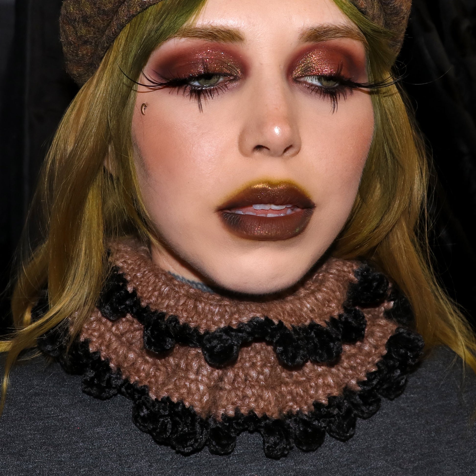 This piece wraps around your neck with a black velvet tie string closure and a ruffle along the top and bottom. There's a black velvet bobble trim. This ruffle was hand crocheted with love.